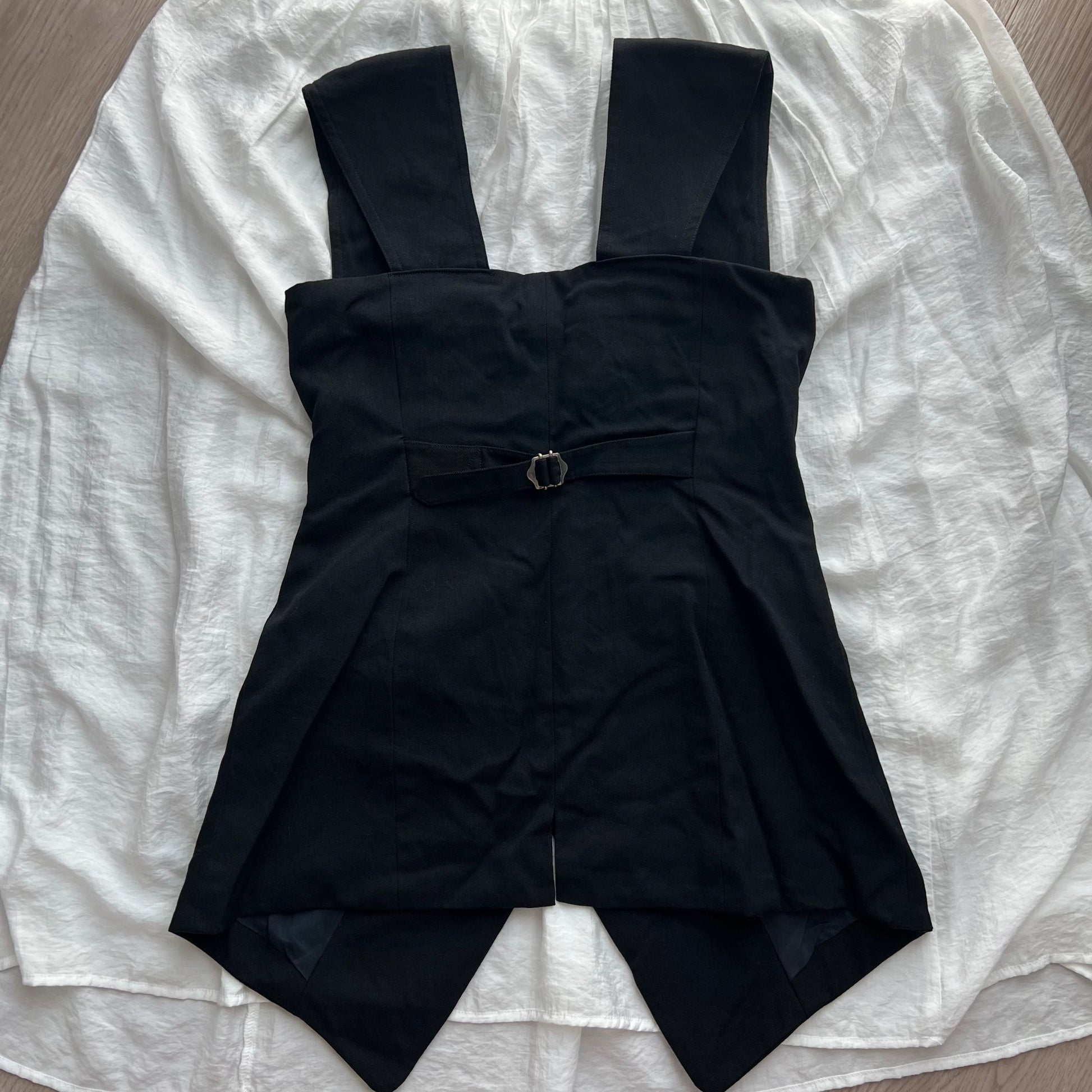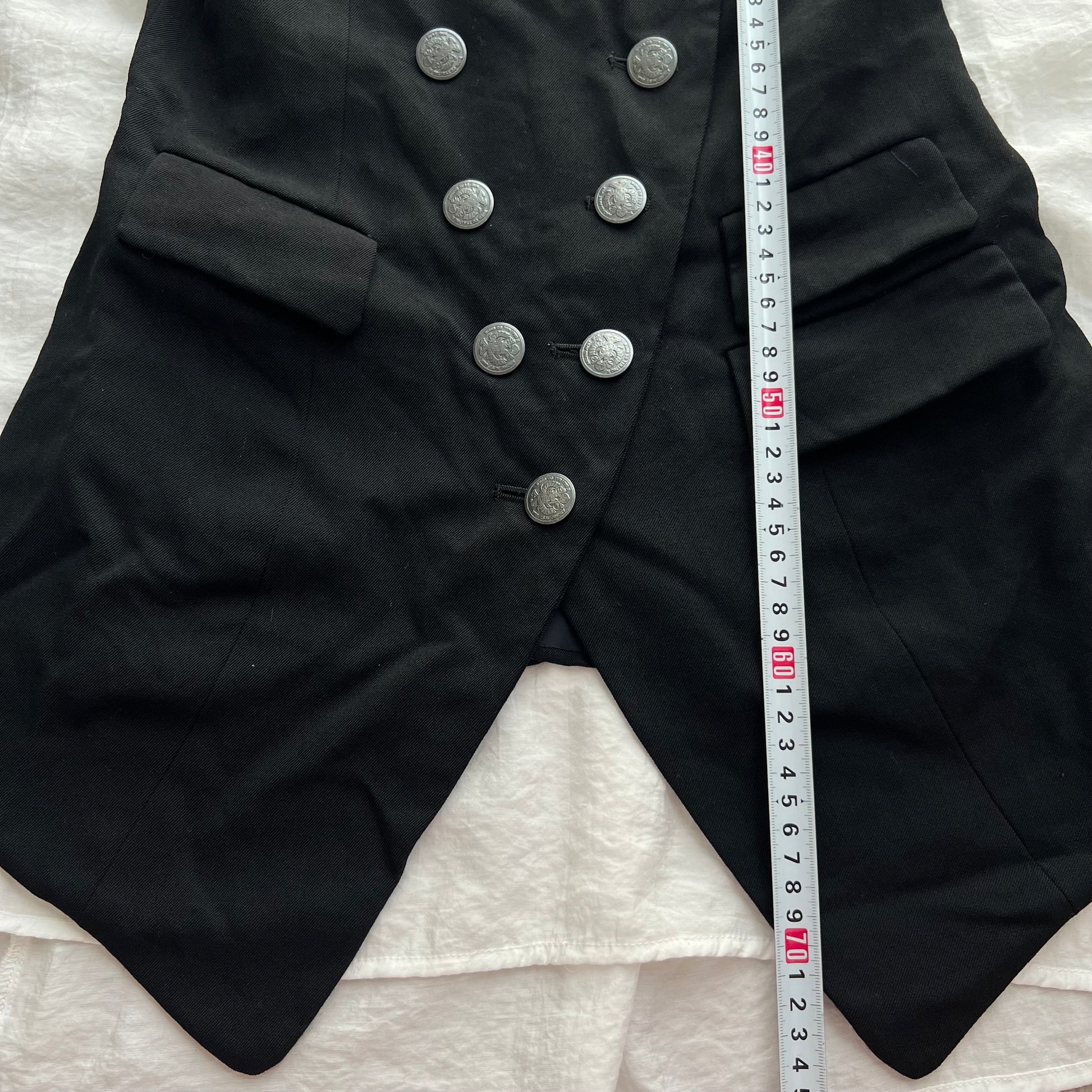 thick material black vest, with beautiful detailed silver color buttons and working pockets! Has an adjustable waist on the back side and a beautiful shape that is great for layering!