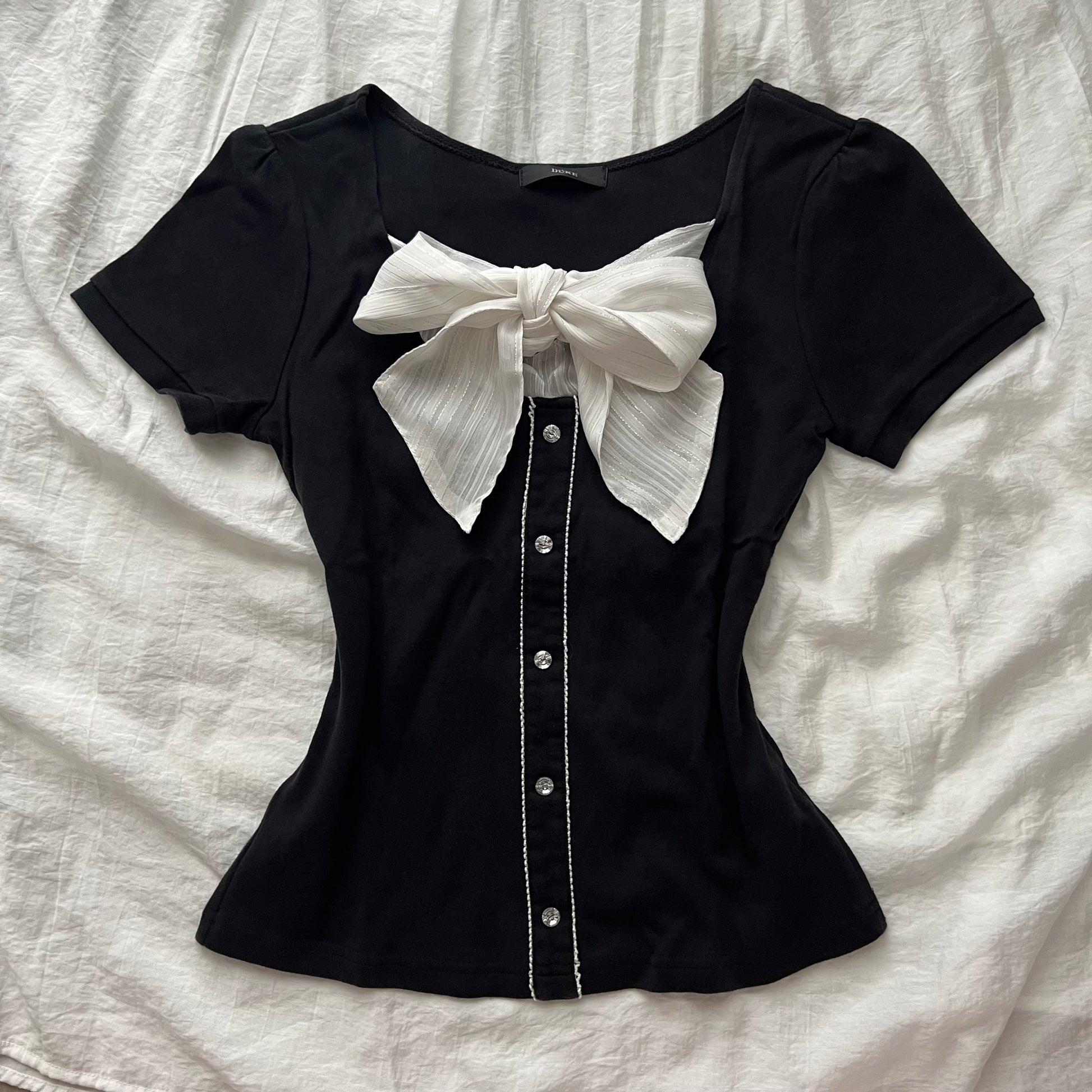 Japanese brand black top with a white sparkly ribbon bow milkmaid vibe on front. Cute rhinestones like buttons.