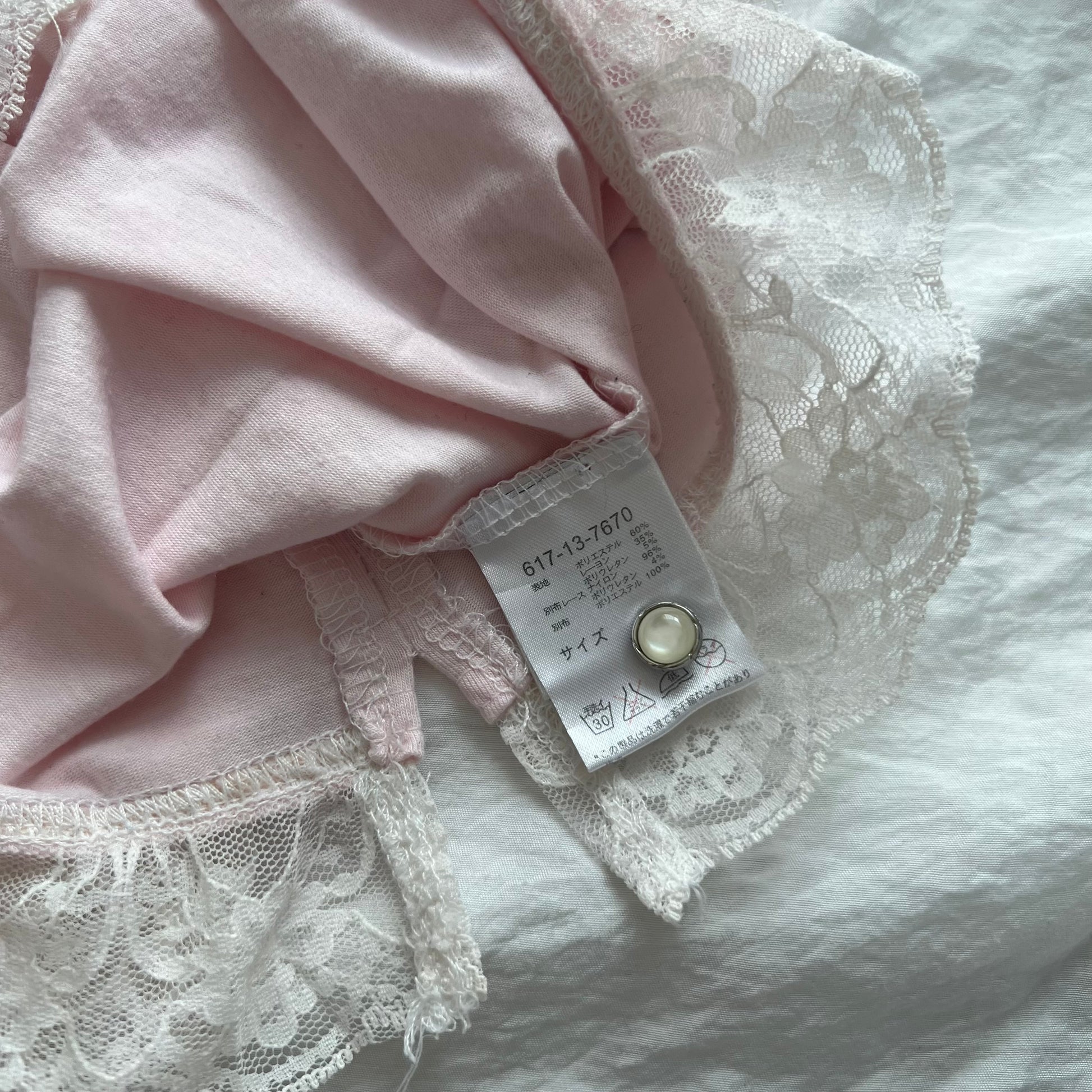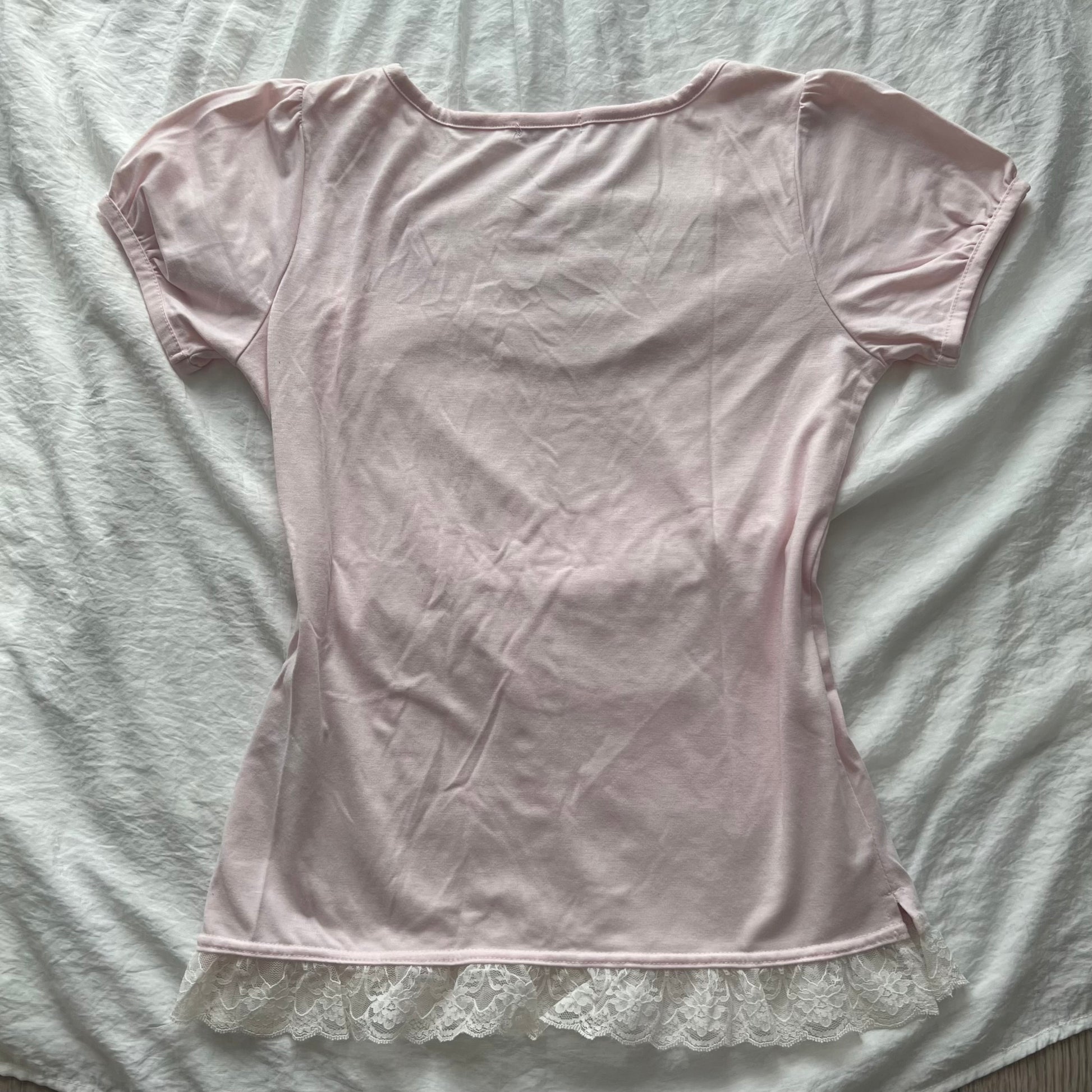 ADORABLE baby pink top with a frilly milkmaid chest, cute button and a lace trip at the edge with a little side slit.