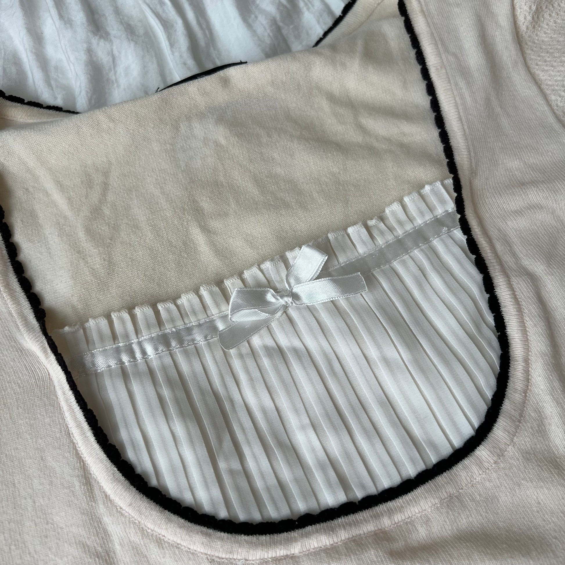 Knit baby pink layered milkmaid puff sleeve top with a ribbon from Japan. The sleeves has a cute pattern.
