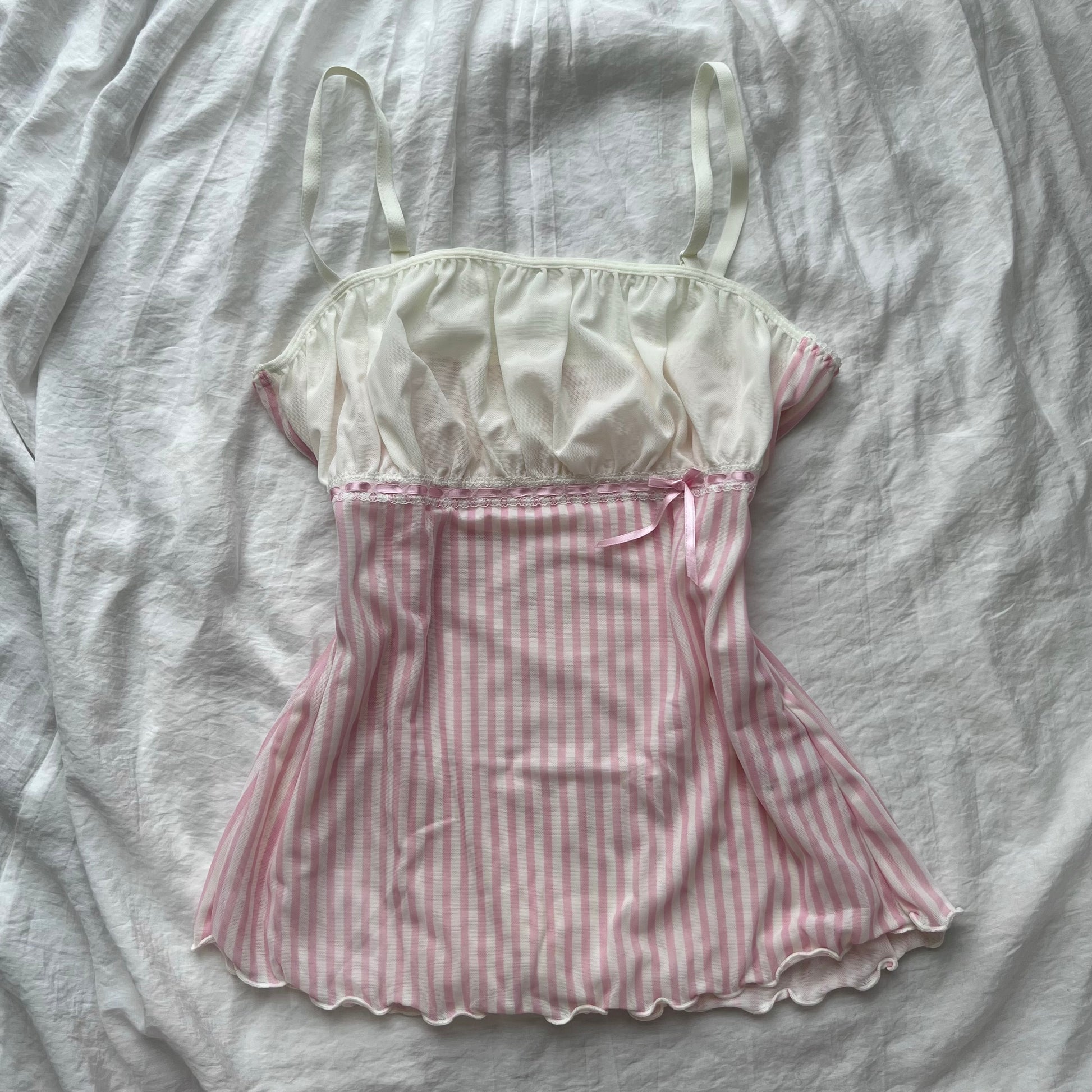Adorable cottage core sweet camisole! A little bit sheer, pink and white stripes, pink ribbon and lace with adjustable straps