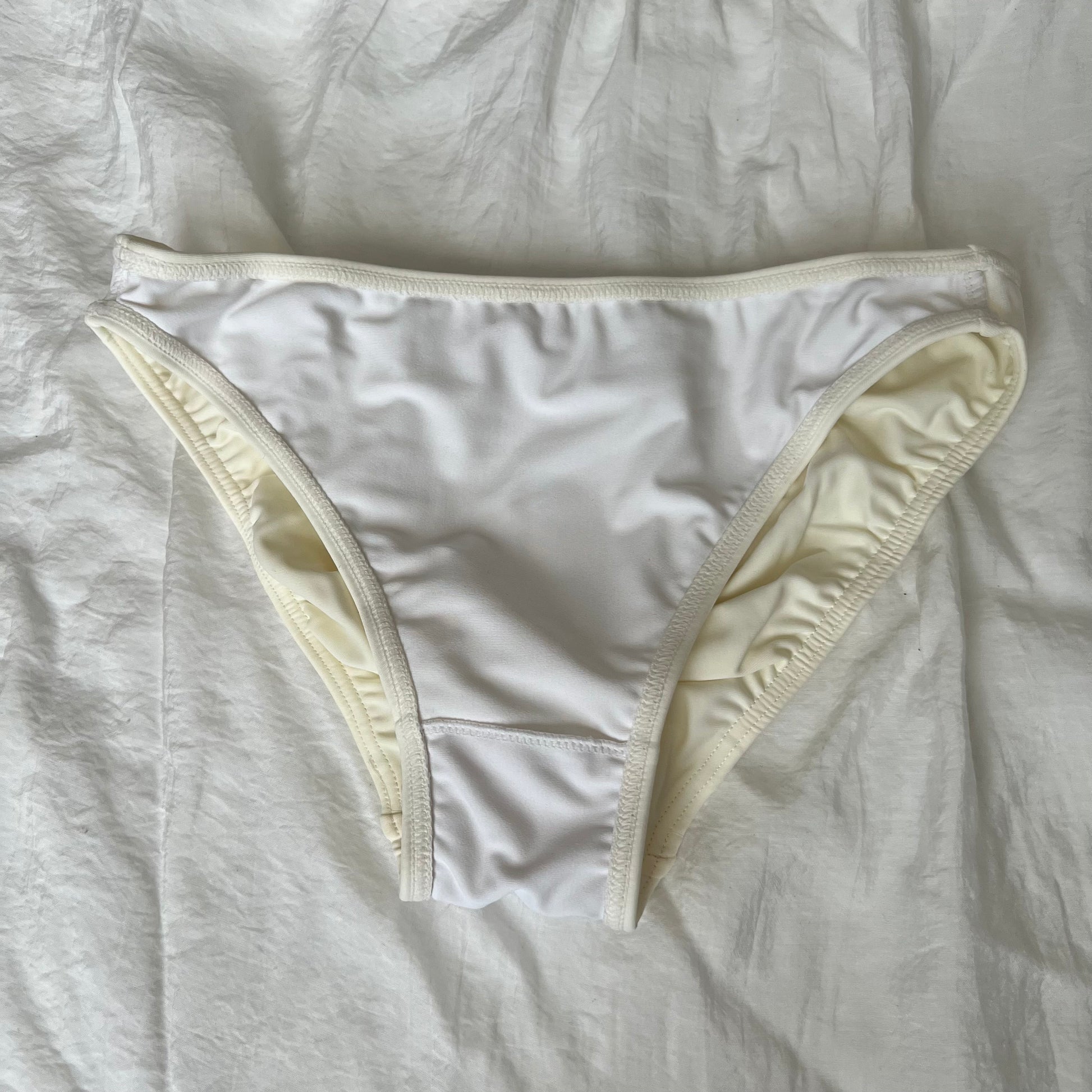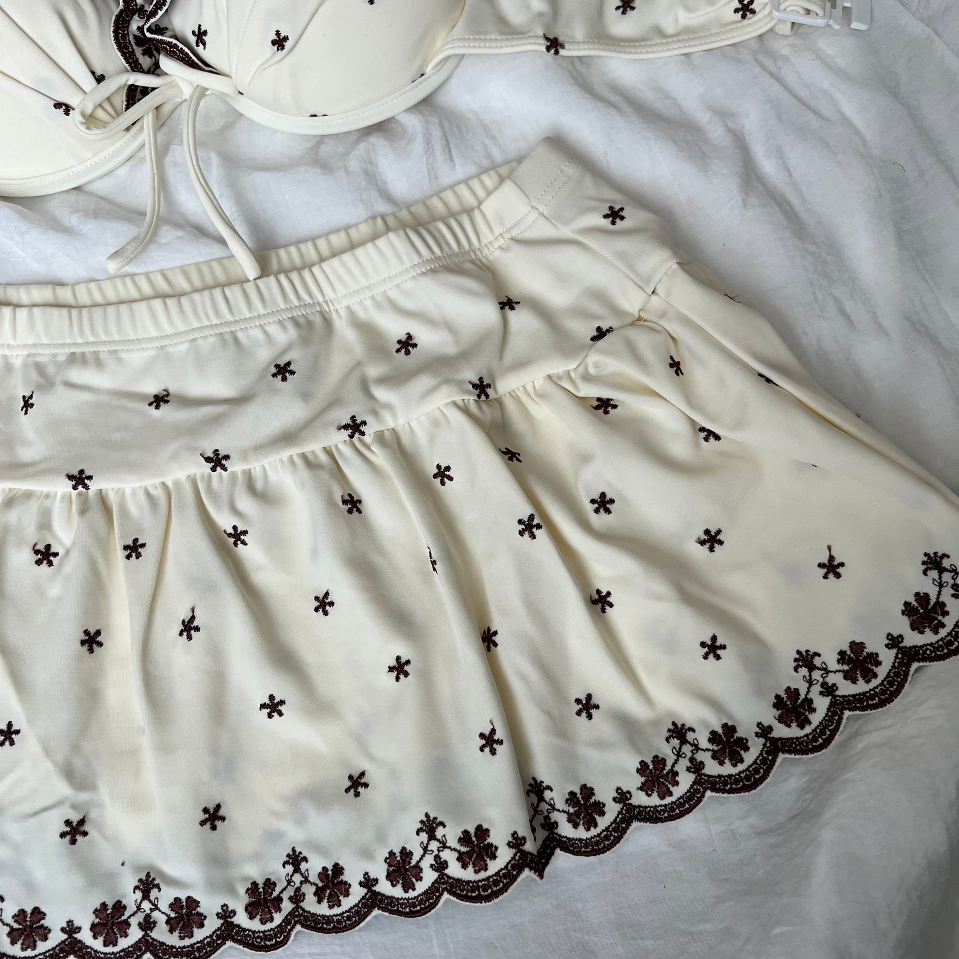 3-piece bikini set. Comes with a padded top, mini skirt, and bottoms. Top features a ruffled halter neck, ribbon bow.