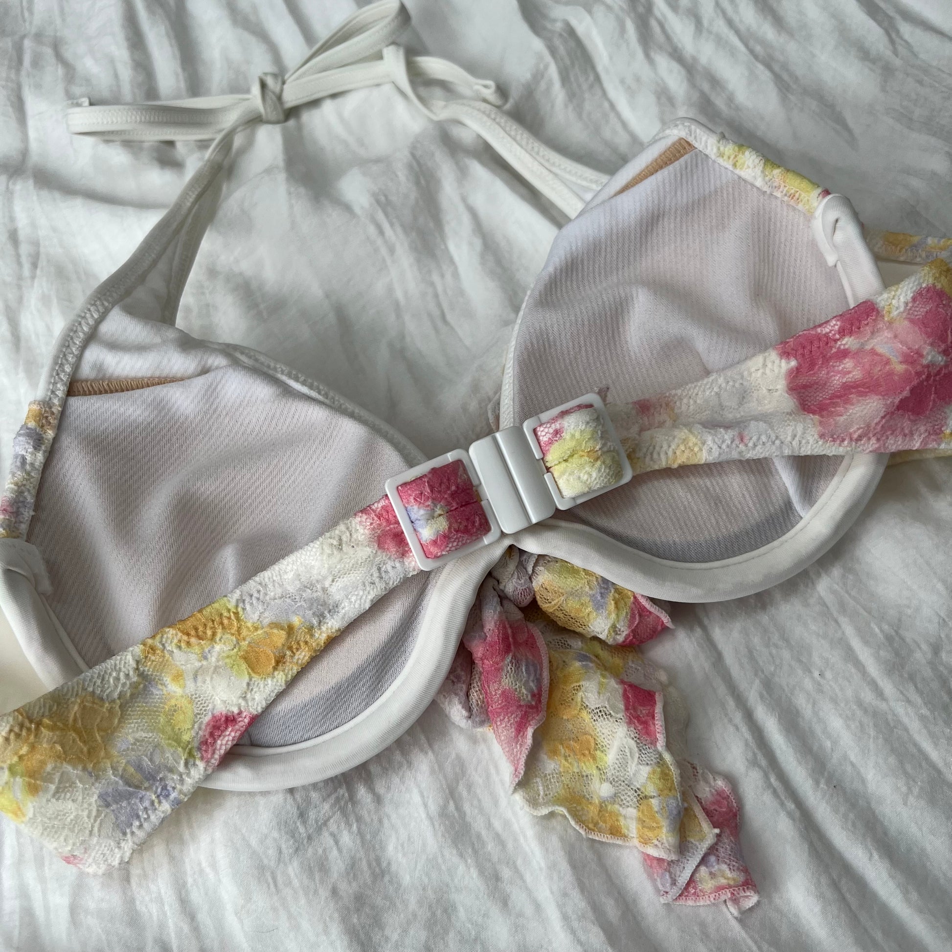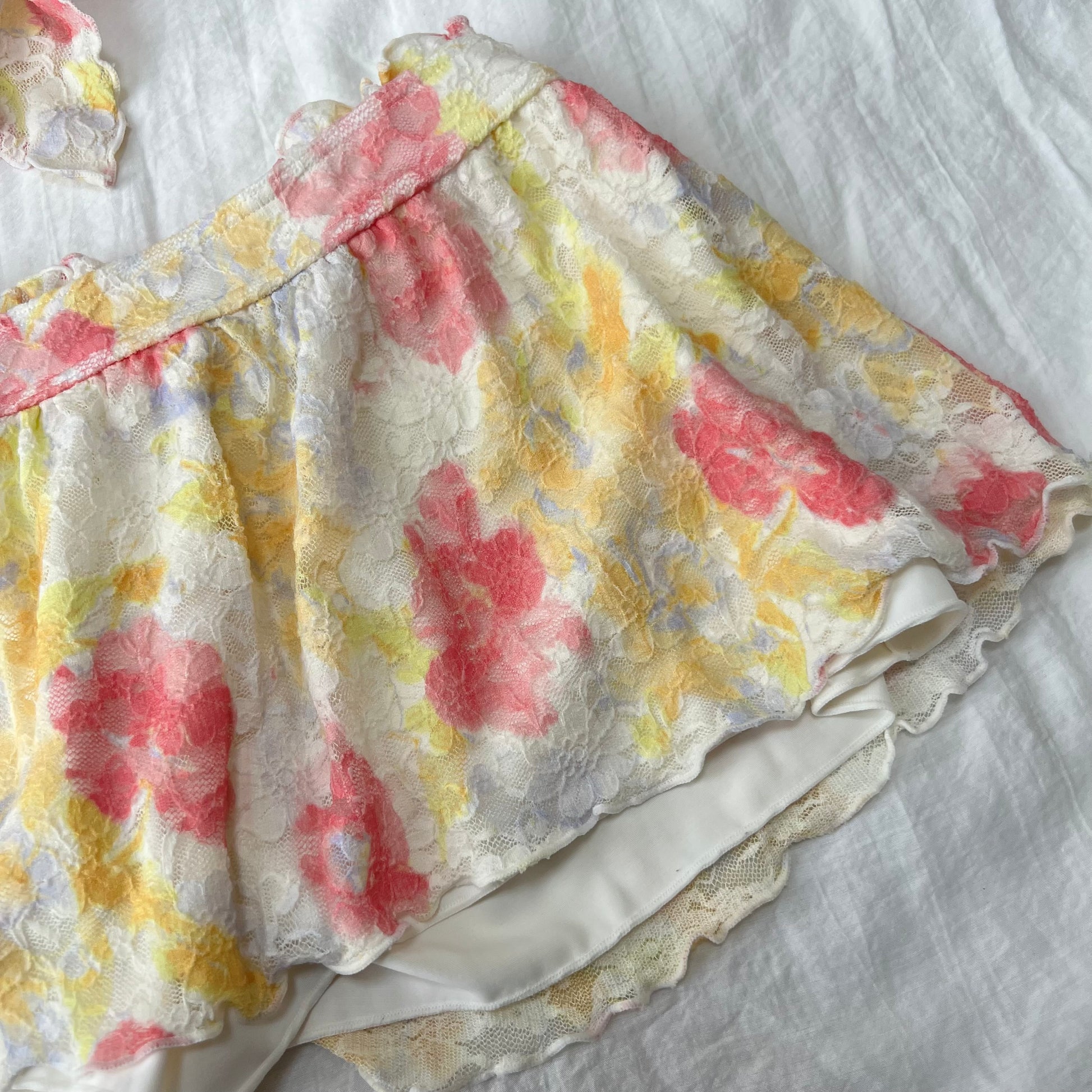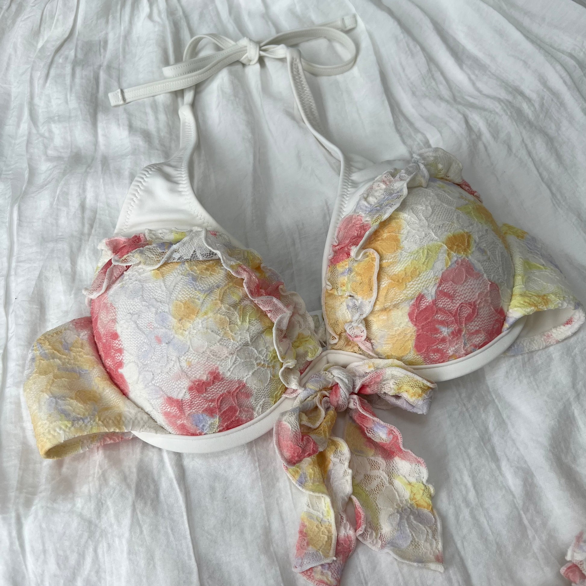 ♡ Girly pink and yellow floral lace and frills 3-piece bikini set. Comes with a padded top, mini skirt, and bottoms. Top features a halter neck and ribbon bow. Bottom skirt features an under layer of white flowy shorts for safety! (See last photo)