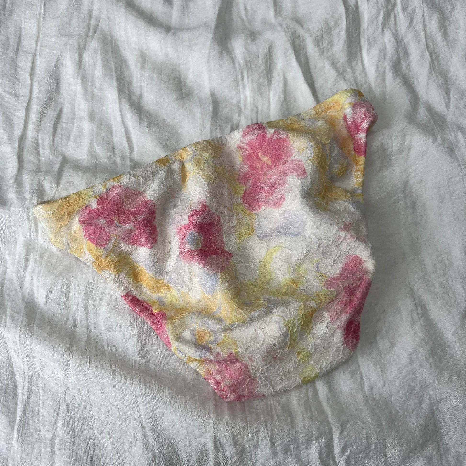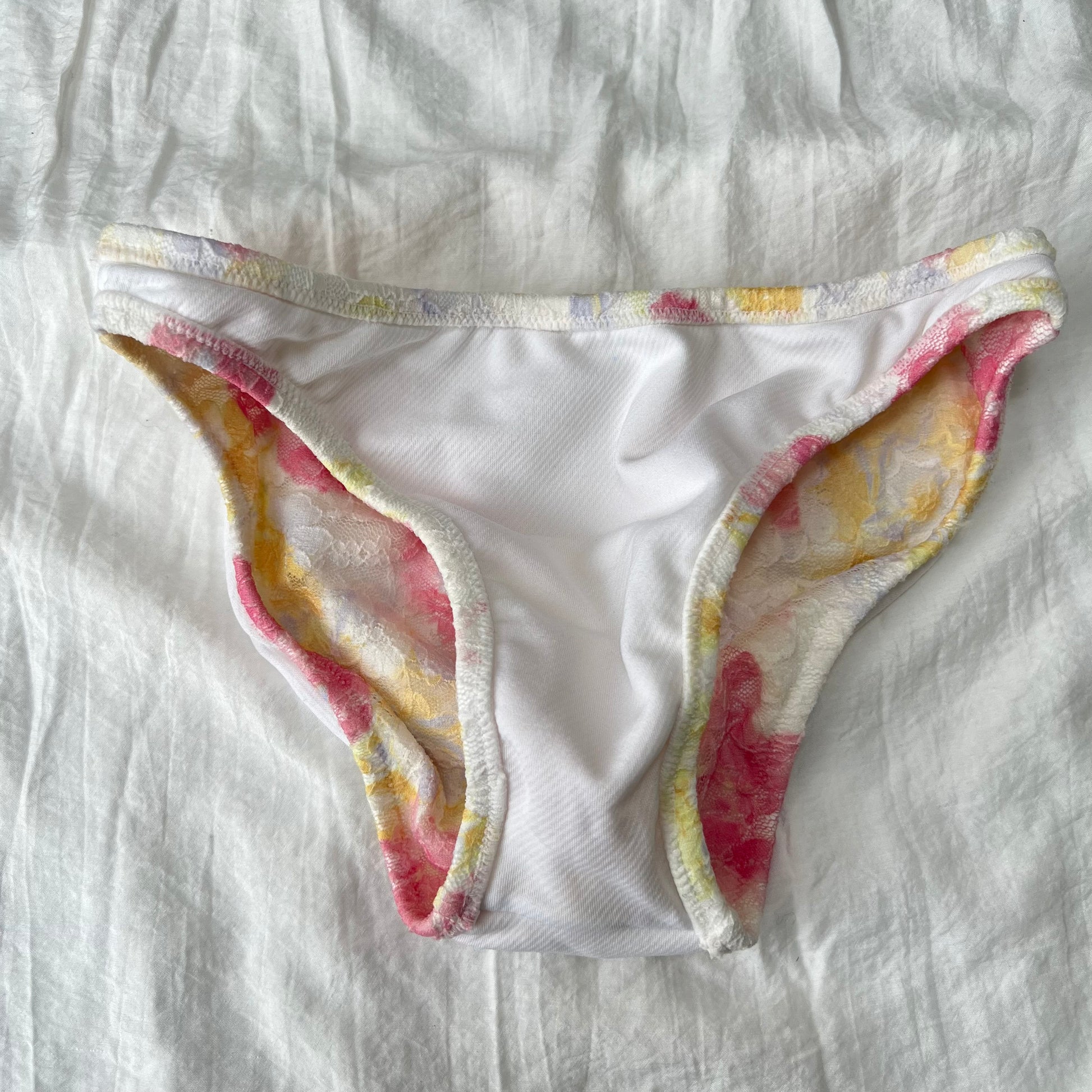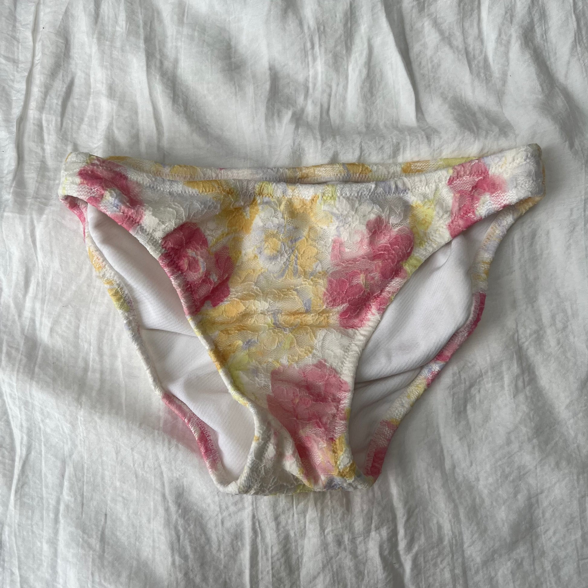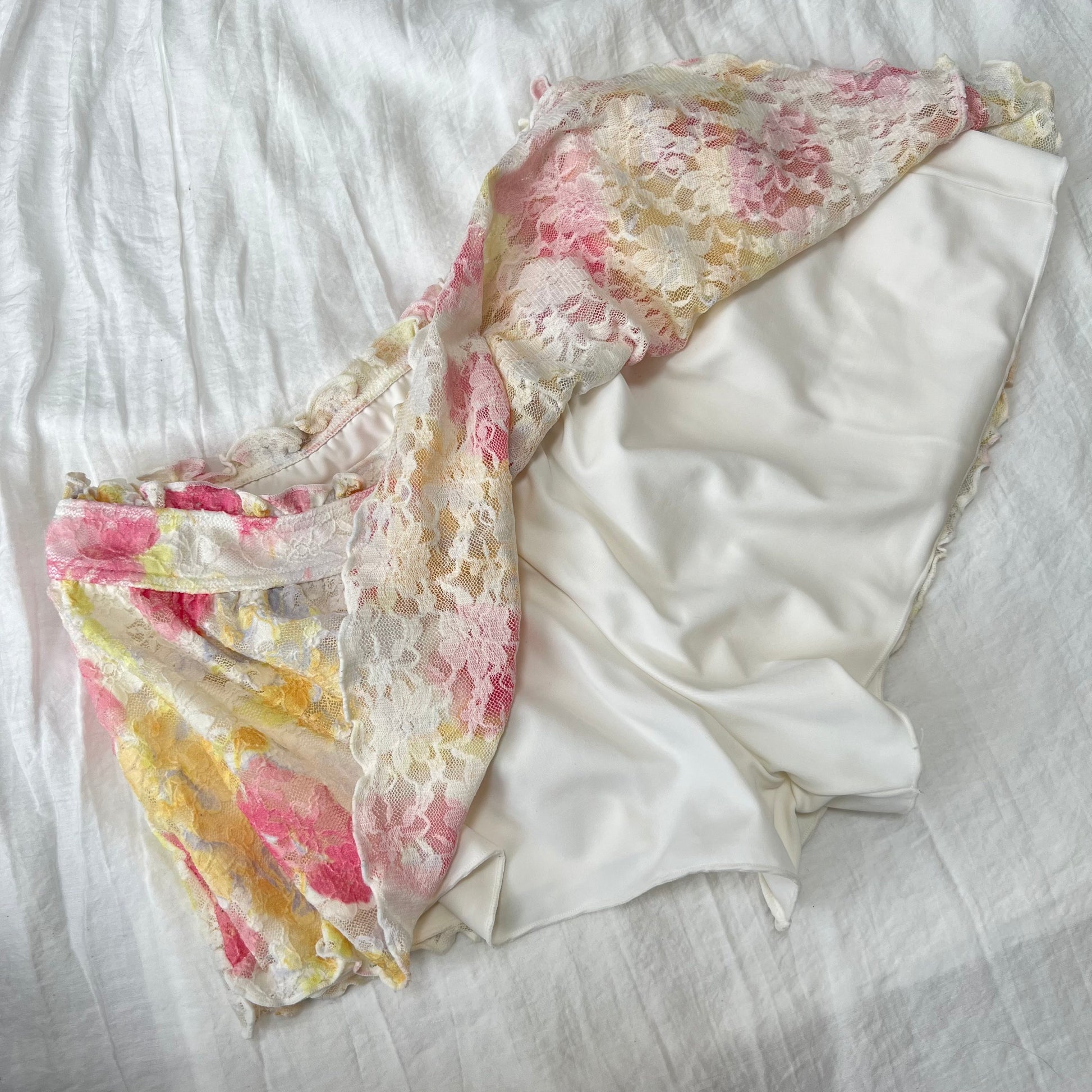 ♡ Girly pink and yellow floral lace and frills 3-piece bikini set. Comes with a padded top, mini skirt, and bottoms. Top features a halter neck and ribbon bow. Bottom skirt features an under layer of white flowy shorts for safety! (See last photo)