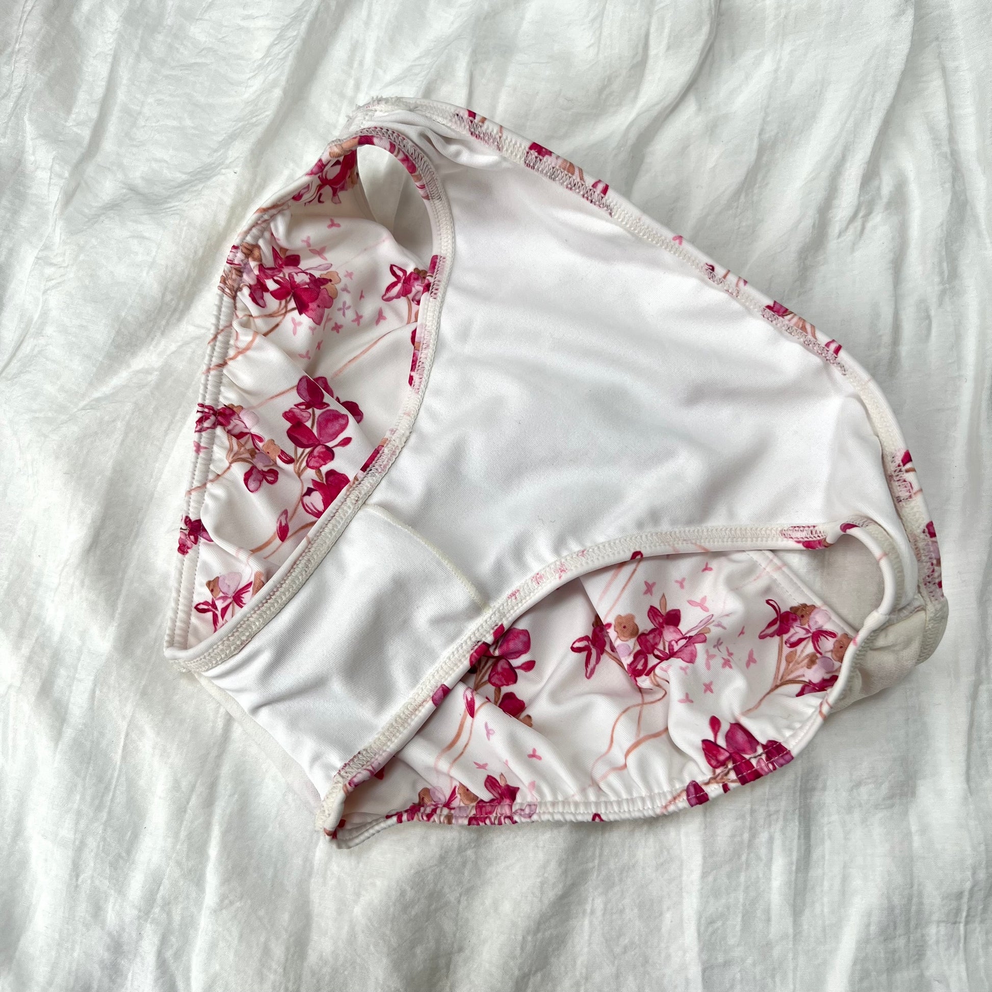 ♡ Girly reddish pink and white floral ruffle 3-piece bikini set. Comes with a padded top, layered mini skirt, and bottoms. Top features a ruffled halter neck, ribbon bow, and cute heart buckle.